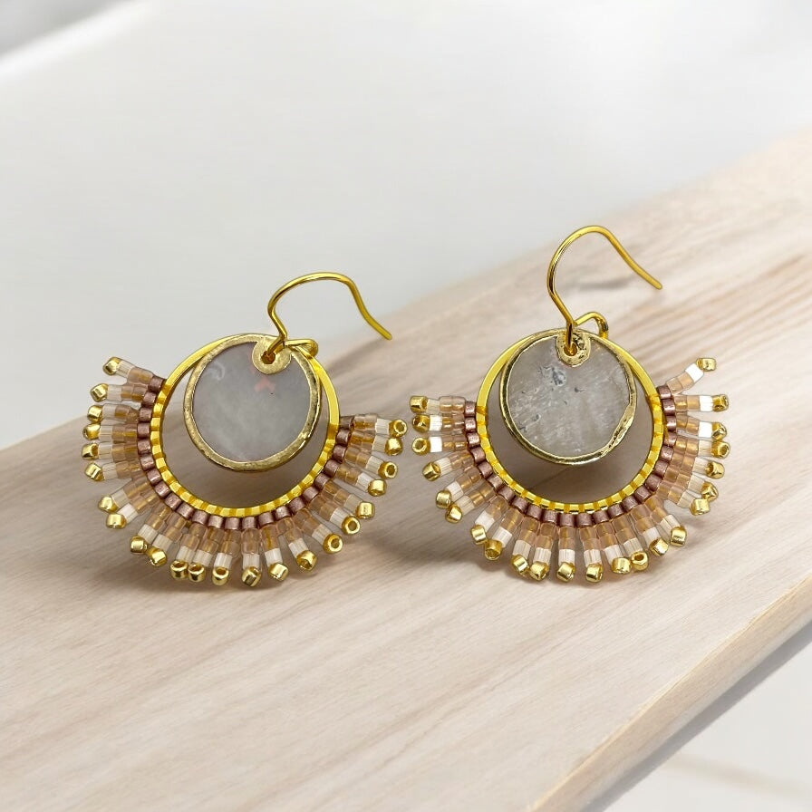Composées de perles miyuki tissées autour d'un anneau en acier inoxydable et d'un pendentif en nacre.