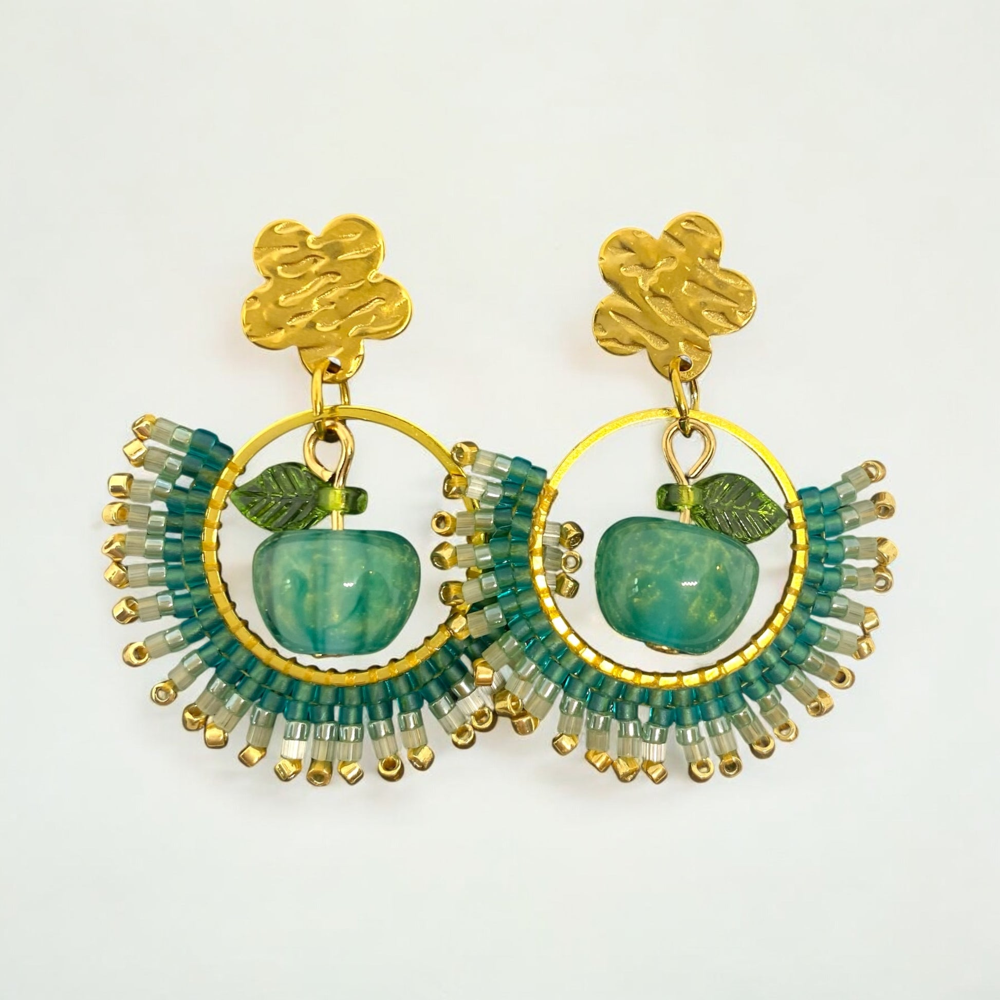 Elles sont réalisées en perles miyuki tissées à la main sur un anneau en acier, agrémentées d'une pomme en verre. Le tout monté sur un clou d'oreille en acier également.