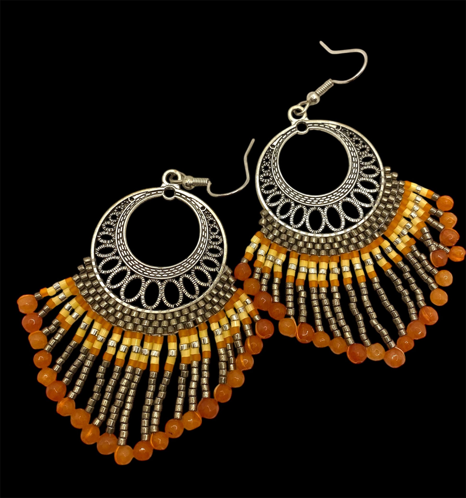 Evadez-vous sur les rivages de la mer Méditerranée avec ces boucles réalisées en perles de verre tissées à la main sur un pendentif en métal argenté (2,5 cm de diamètre). Des perles en pierre fines viennent agrémenter les extrêmités des franges.
