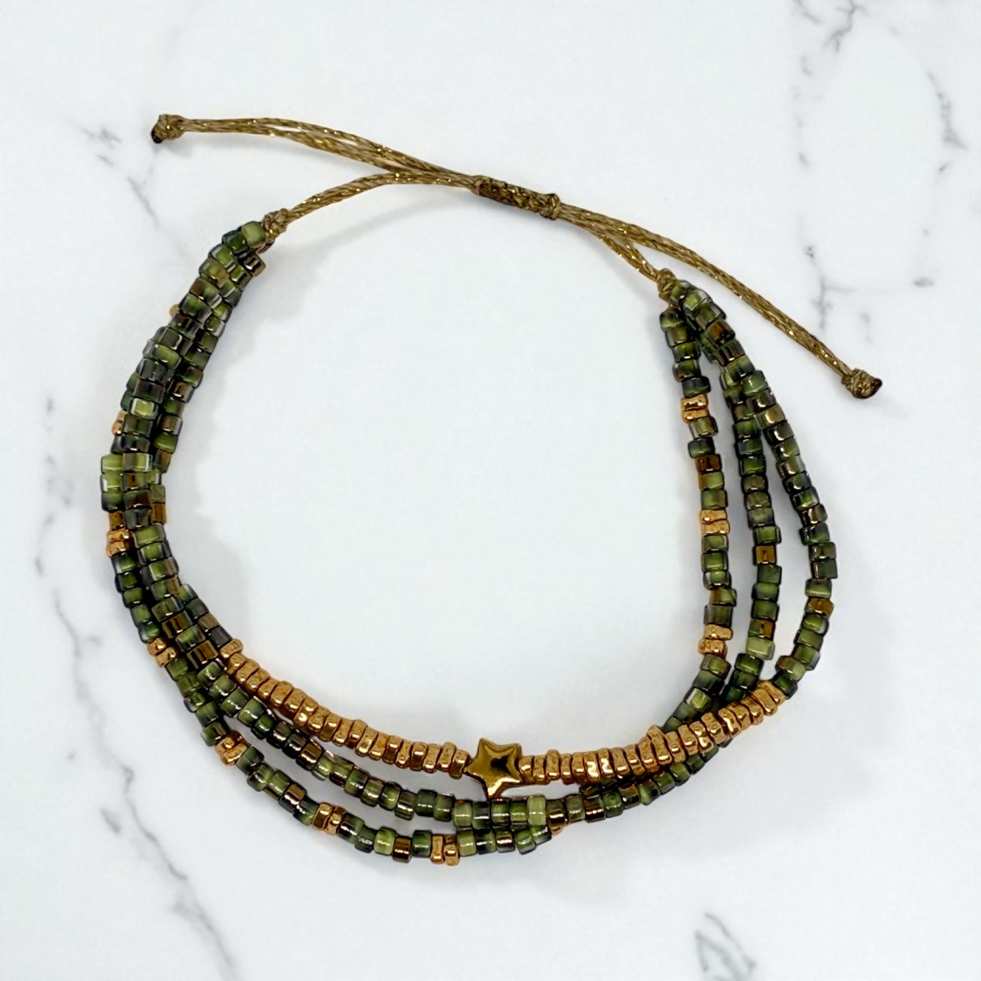 Découvrez ce bracelet réglable composé de 3 tours de perles en verre et d'une perle "étoile" en acier inoxydable. Il agrémentera vos tenues de façon chic  en apportant de la lumière à votre poignet.