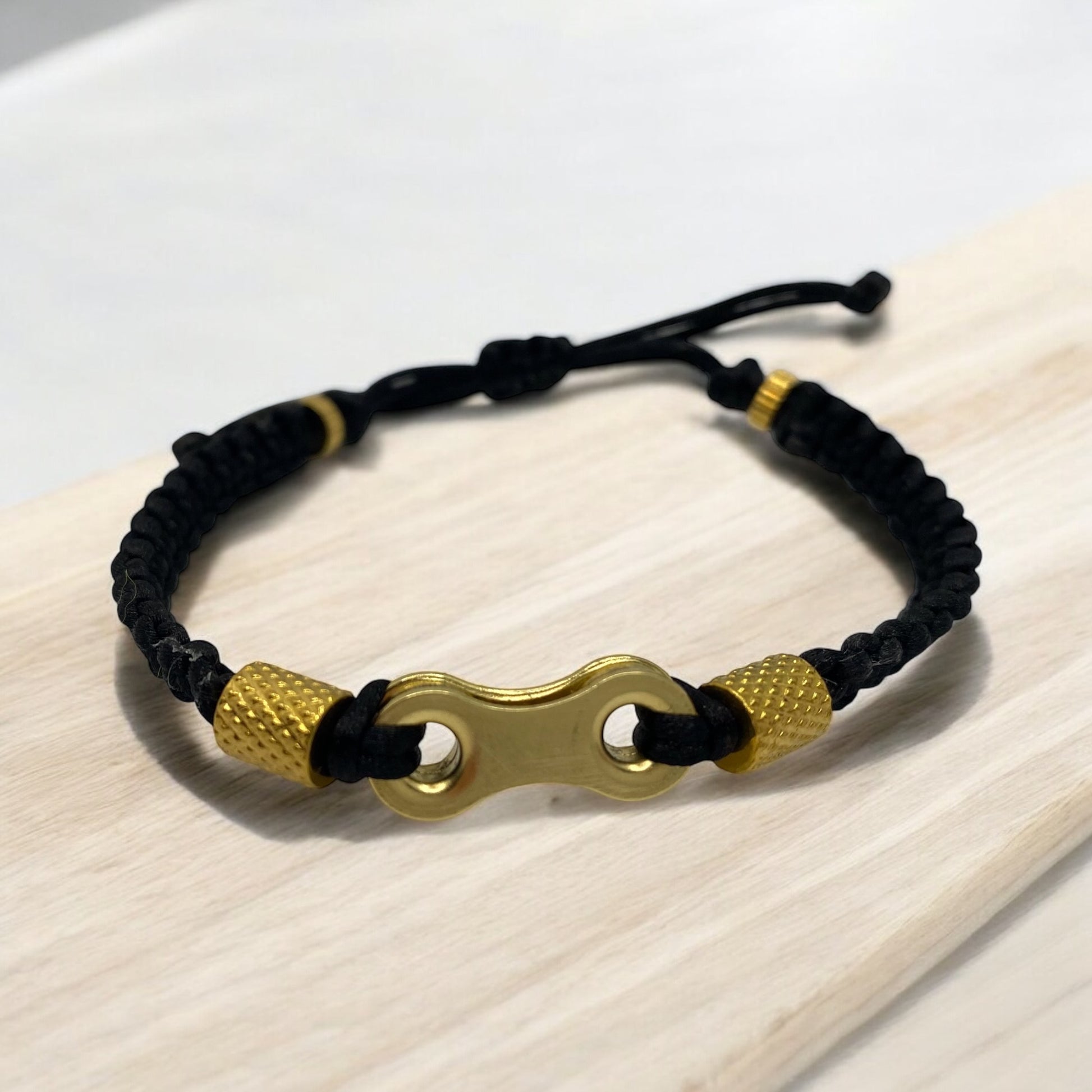 Imaginé pour les passionnées de sport en pleine nature, ce bracelet réglable est conçu autour d’un maillon de chaîne de vélo en acier accompagné de perles en acier doré. .