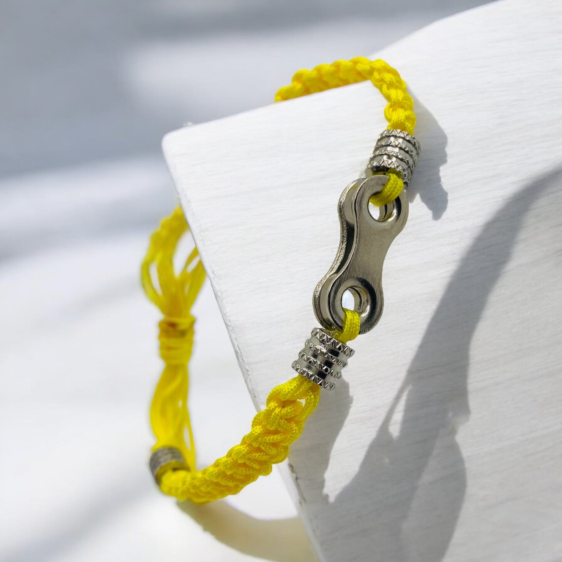 Imaginé pour les passionnées de sport en pleine nature, ce bracelet réglable est conçu autour d’un maillon de chaîne de vélo en acier accompagné de perles en acier argenté .