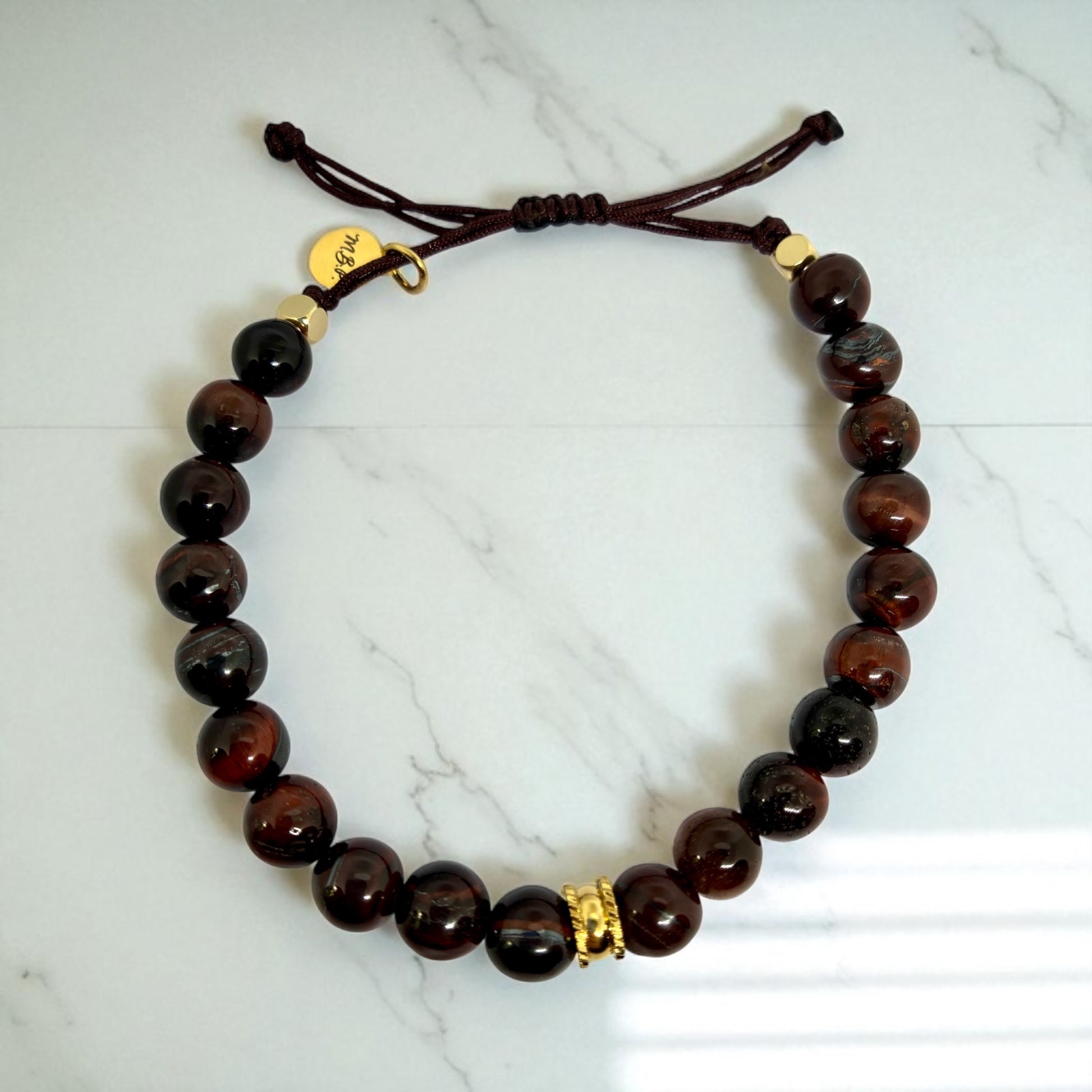 Bracelet réglable pour hommes en perles Chrysobéril ("Oeil de chat") et perles en acier doré.