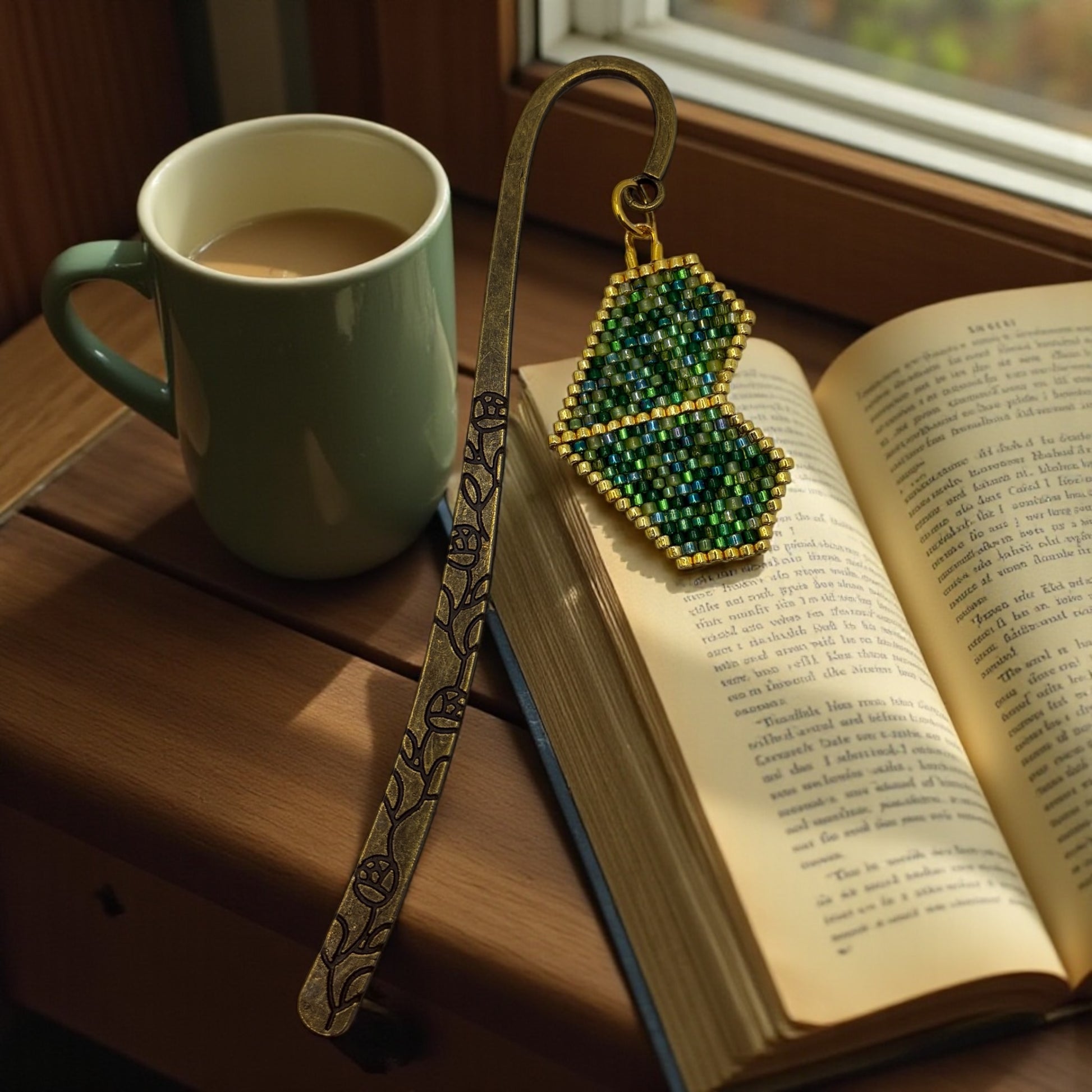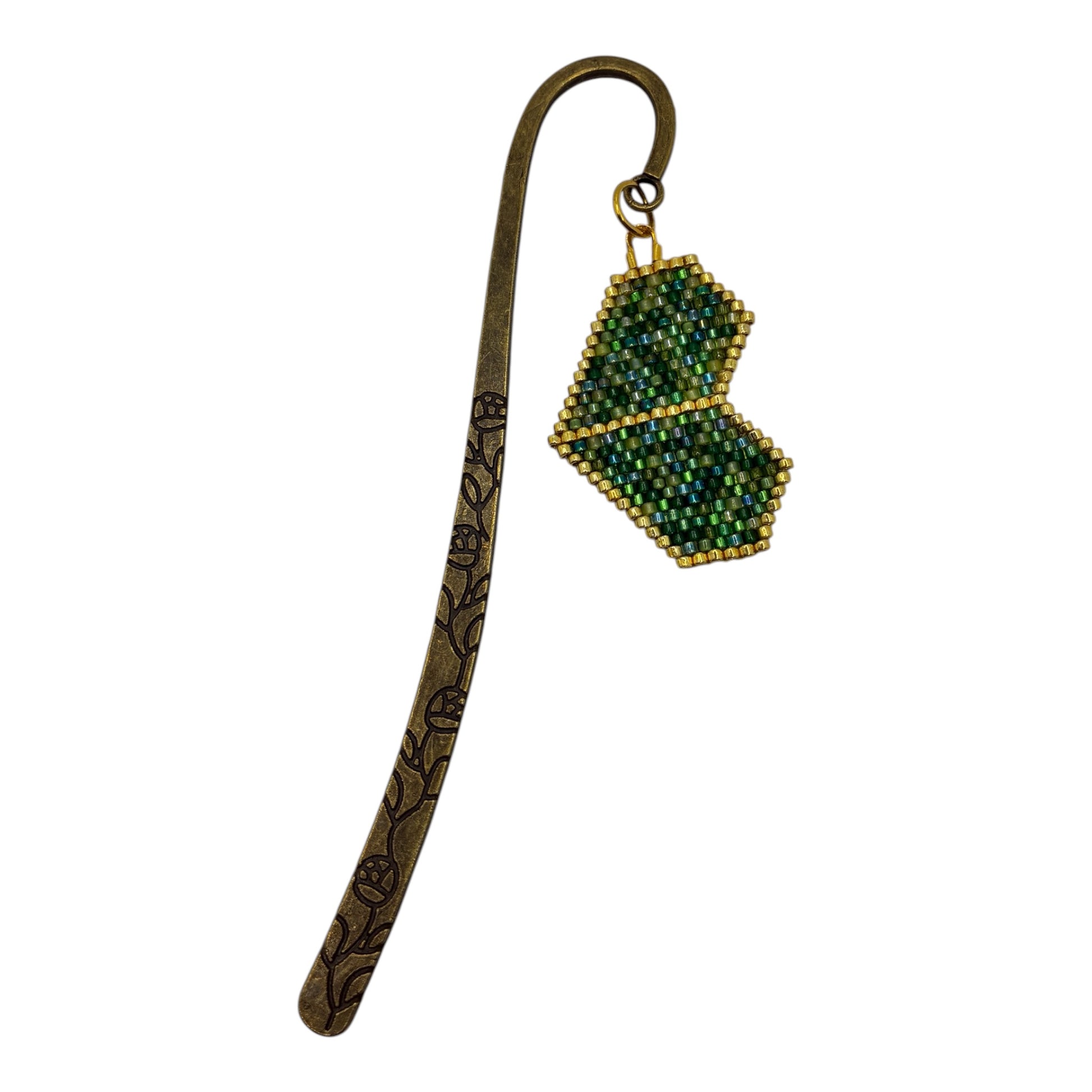 Marque page en métal couleur bronze et perles japonaises Miyuki tissées à la main dans mon atelier provençal.