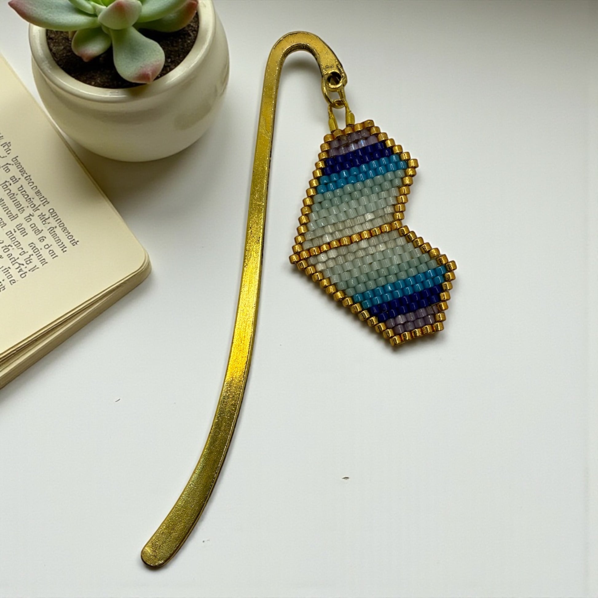 Marque page en métal doré et perles japonaises Miyuki tissées à la main dans mon atelier provençal.